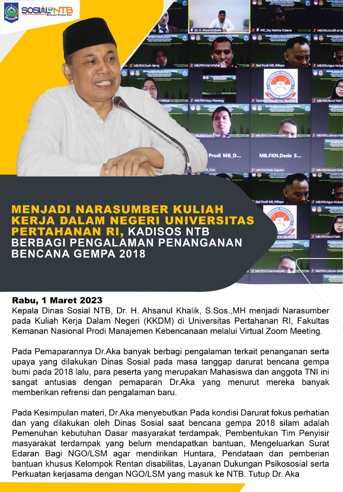 Kepala Dinas Sosial NTB Dr. H. Ahsanul Khalik, S. Sos., MH menjadi Narasumber Kuliah Kerja Dalam Negeri (KKDN) Universitas Pertahanan RI melalu Zoom Meeting, dalam kesempatan tersebut Dr. Aka banyak berbagi pengalaman terkait penanganan bencana gempa bumi Lombok tahun 2018