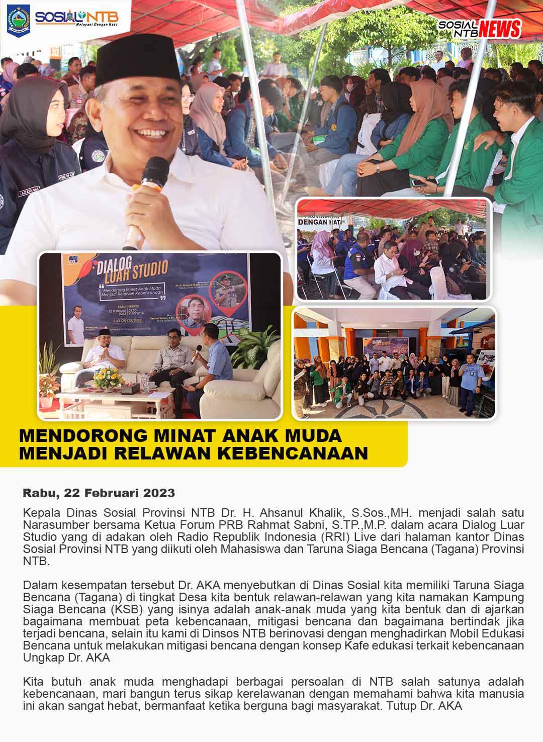 Kepala Dinas Sosial Provinsi NTB Dr. H. Ahsanul Khalik, S.Sos.,MH. menjadi salah satu Narasumber bersama Ketua Forum PRB Rahmat Sabni, S.TP.,M.P. dalam acara Dialog Luar Studio yang di adakan oleh Radio Republik Indonesia (RRI) Live dari halaman kantor Dinas Sosial Provinsi NTB yang diikuti oleh Mahasiswa dan Taruna Siaga Bencana (Tagana) Provinsi NTB.Dalam kesempatan tersebut Dr. AKA menyebutkan di Dinas Sosial kita memiliki Taruna Siaga Bencana (Tagana) di tingkat Desa kita bentuk relawan-relawan yang kita namakan Kampung Siaga Bencana (KSB) yang isinya adalah anak-anak muda yang kita bentuk dan di ajarkan bagaimana membuat peta kebencanaan, mitigasi bencana dan bagaimana bertindak jika terjadi bencana, selain itu kami di Dinsos NTB berinovasi dengan menghadirkan Mobil Edukasi Bencana untuk melakukan mitigasi bencana dengan konsep Kafe edukasi terkait kebencanaan Ungkap Dr. AKAKita butuh anak muda menghadapi berbagai persoalan di NTB salah satunya adalah kebencanaan, mari bangun terus sikap kerelawanan dengan memahami bahwa kita manusia ini akan sangat hebat, bermanfaat ketika berguna bagi masyarakat. Tutup Dr. AKA
