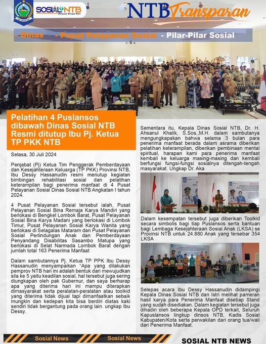 Penjabat (Pj) Ketua Tim Penggerak Pemberdayaan dan Kesejahteraan Keluarga (TP PKK) Provinsi NTB, Ibu Dessy Hassanudin resmi menutup kegiatan bimbingan rehabilitasi sosial dan pelatihan keterampilan bagi penerima manfaat di 4 Pusat Pelayanan Sosial Dinas Sosial NTB Angkatan I tahun 2024.