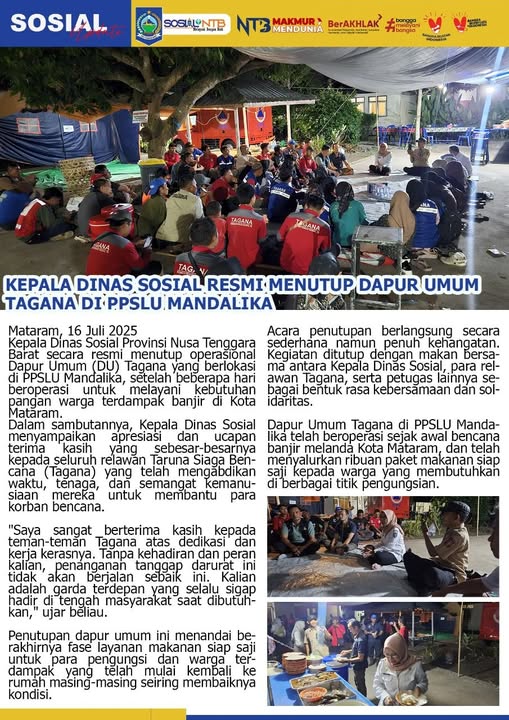 Kepala Dinas Sosial Provinsi Nusa Tenggara Barat Menutup Dapur Umum (DU) Tagana di PPSLU Mandalika 16 Juli 202524 Juli 2025 Tim Humas Post Views: 11