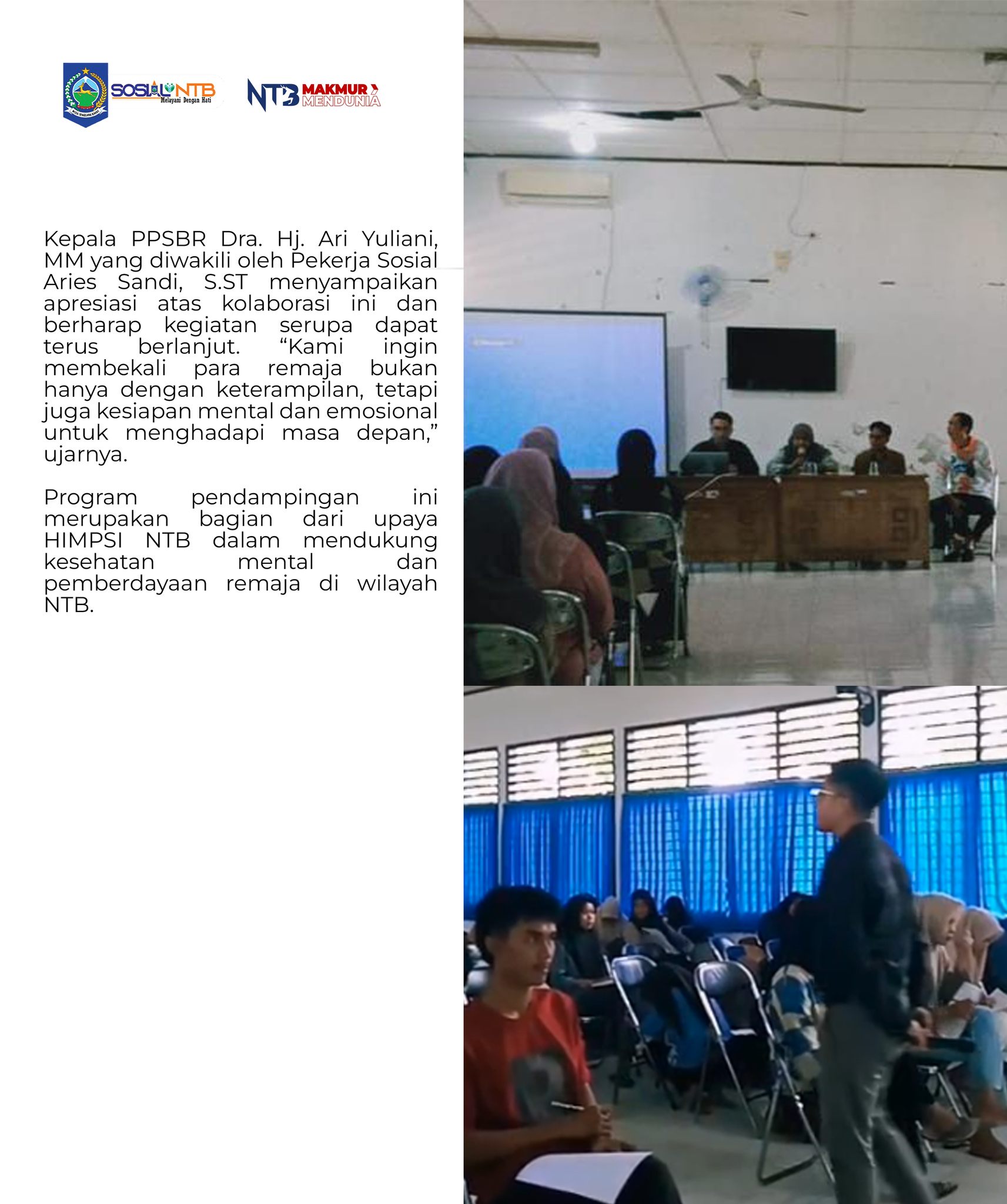 Penerima manfaat di Pusat Pelayanan Sosial Bina Remaja (PPSBR) Karya Mandiri mendapatkan pendampingan khusus dari tim psikolog yang tergabung dalam Himpunan Psikologi Indonesia (HIMPSI) Wilayah Nusa Tenggara Barat (NTB). Kegiatan ini bertujuan untuk memberikan motivasi dan penguatan diri kepada para remaja agar mampu menggali potensi diri secara maksimal.