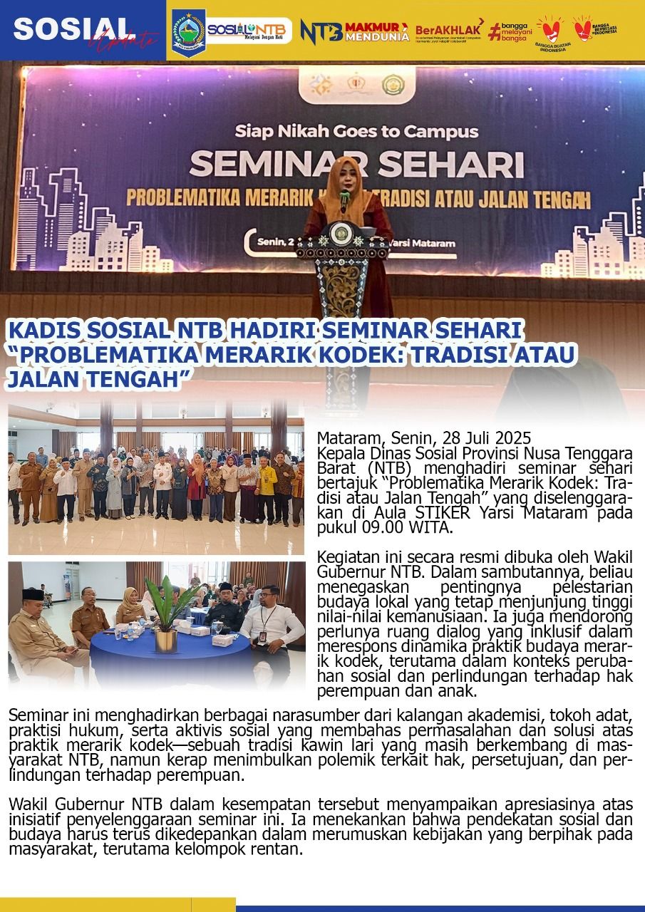 Kepala Dinas Sosial Provinsi NTB Hadiri Seminar Sehari “Problematika Merarik Kodek : Tradisi Atau Jalan Tengah” 28 Juli 202530 Juli 2025 Tim Humas Post Views: 54