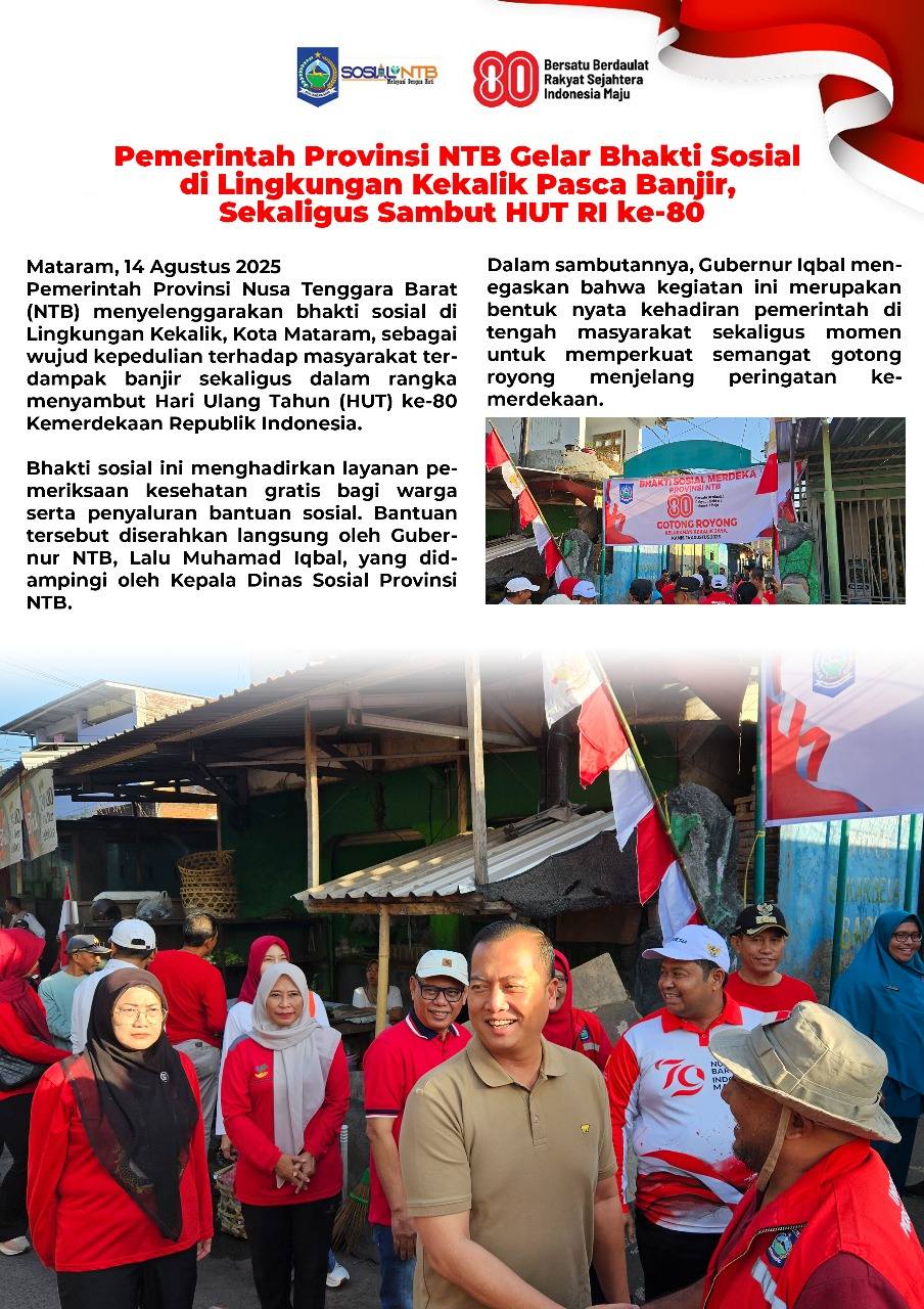 Pemerintah Provinsi NTB Gelar Bhakti Sosial di Lingkungan Kekalik Pasca Banjir Sekaligus Sambut HUT RI Ke-80 14 Agustus 202519 Agustus 2025 Tim Humas Post Views: 10