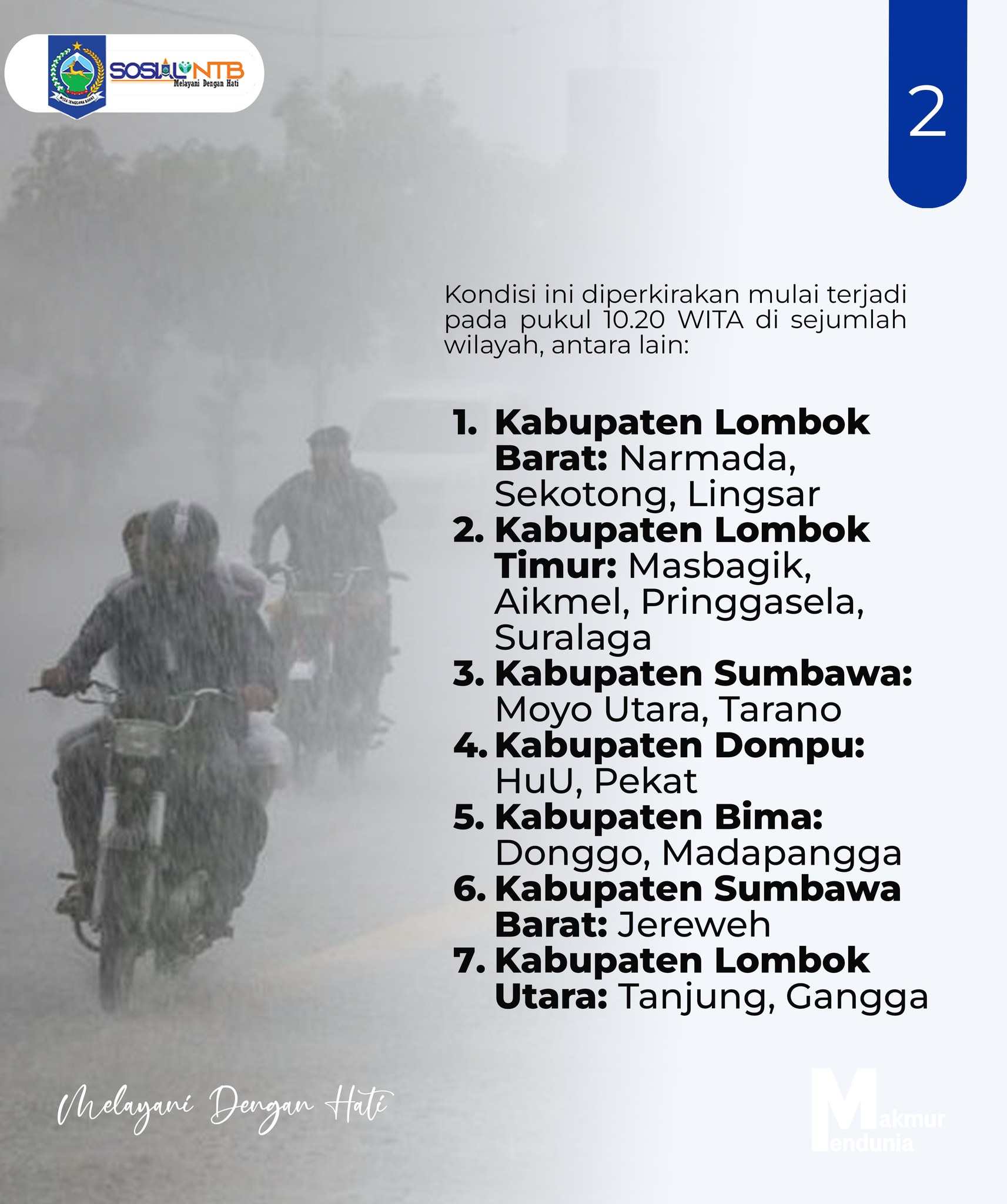 Badan Meteorologi, Klimatologi, dan Geofisika (BMKG) mengeluarkan peringatan dini cuaca untuk wilayah Nusa Tenggara Barat pada Selasa, 9 September 2025, pukul 10.15 WITA. BMKG memprediksi adanya potensi hujan dengan intensitas sedang hingga lebat yang dapat disertai kilat atau petir serta angin kencang.