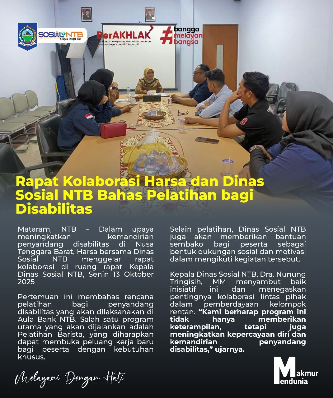 Rapat Kolaborasi Harsa dan Dinas Sosial Provinsi NTB Bahas Pelatihan bagi Disabilitas 13 Oktober 202514 Oktober 2025 Tim Humas Post Views: 11