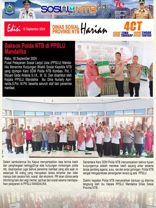 Pusat Pelayanan Sosial Lanjut Usia (PPSLU) Mandalika Menerima Kunjungan Bhakti Sosial Kapolda NTB yang dpimpin Karo SDM Polda NTB Kombes. Pol. I Wayan Gede Ardana S.I.K., M. Si. Dan disambut oleh Kepala PPSLU Mandalika Ibu Dina Nurlaily Aprinaida,S.Psi. M.Pd. beserta seluruh staf dan penerima manfaat.