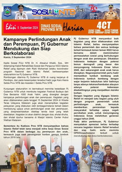 Kadis Sosial Prov NTB Dr. H. Ahsanul Khalik, Sos., MH didampingi Kabid Rehabilitasi Sosial dan Pengurus NGO Islamic Relief yang dipimpin oleh Rizki Mohamad selaku koordinator program Nasional dari Islamic Relief, berkesempatan silaturahhim ke Pj Gubernur NTB.Rombongan diterima Pj Gubernur NTB di ruang kerjanya di Pendopo, dan pada kesempatan tersebut hadir juga Karo Kesra Setda Prov NTB dan Assisten I Setda Prov NTB.Kunjungan silaturrahim ini bermaksud meminta kesediaan Pj Gubernur NTB untuk membuka kegiatan Festival Budaya dan Doa Bersama 1000 Anak Yatim, yang dirangkai dengan kampanye perlindungan anak dan perempuan.