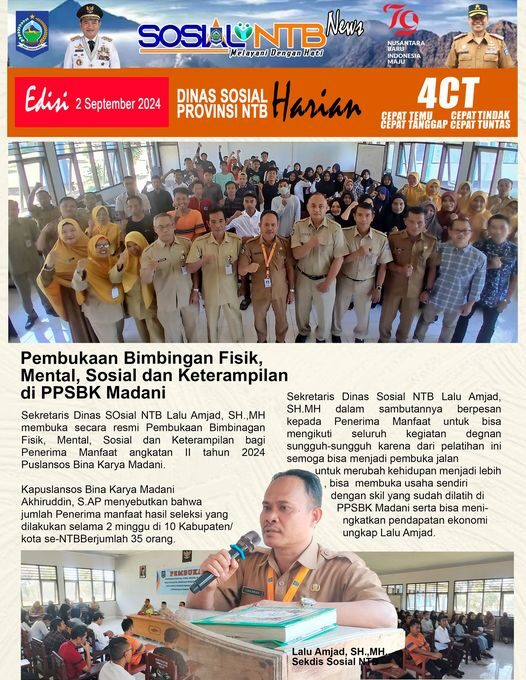 Sekretaris Dinas SOsial NTB Lalu Amjad, SH.,MH membuka secara resmi Pembukaan Bimbinagan Fisik, Mental, Sosial dan Keterampilan bagi Penerima Manfaat angkatan II tahun 2024 Puslansos Bina Karya Madani.