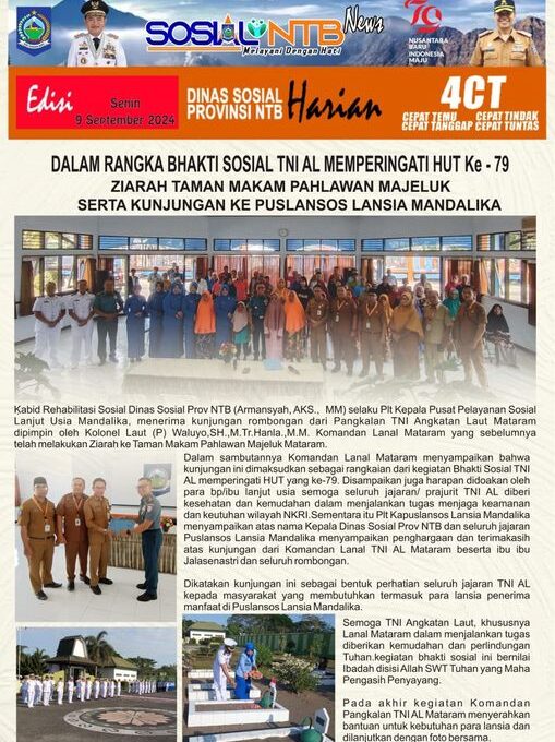 Dalam rangka Bhakti Sosial TNI AL Memperingati HUT ke 79 melakukan kegiatan Ziarah Taman Makam Pahlawan Majeluk Mataram serta Kunjungan ke Pusat Pelayanan Sosial Lanjut Usia ” Mandalika “.